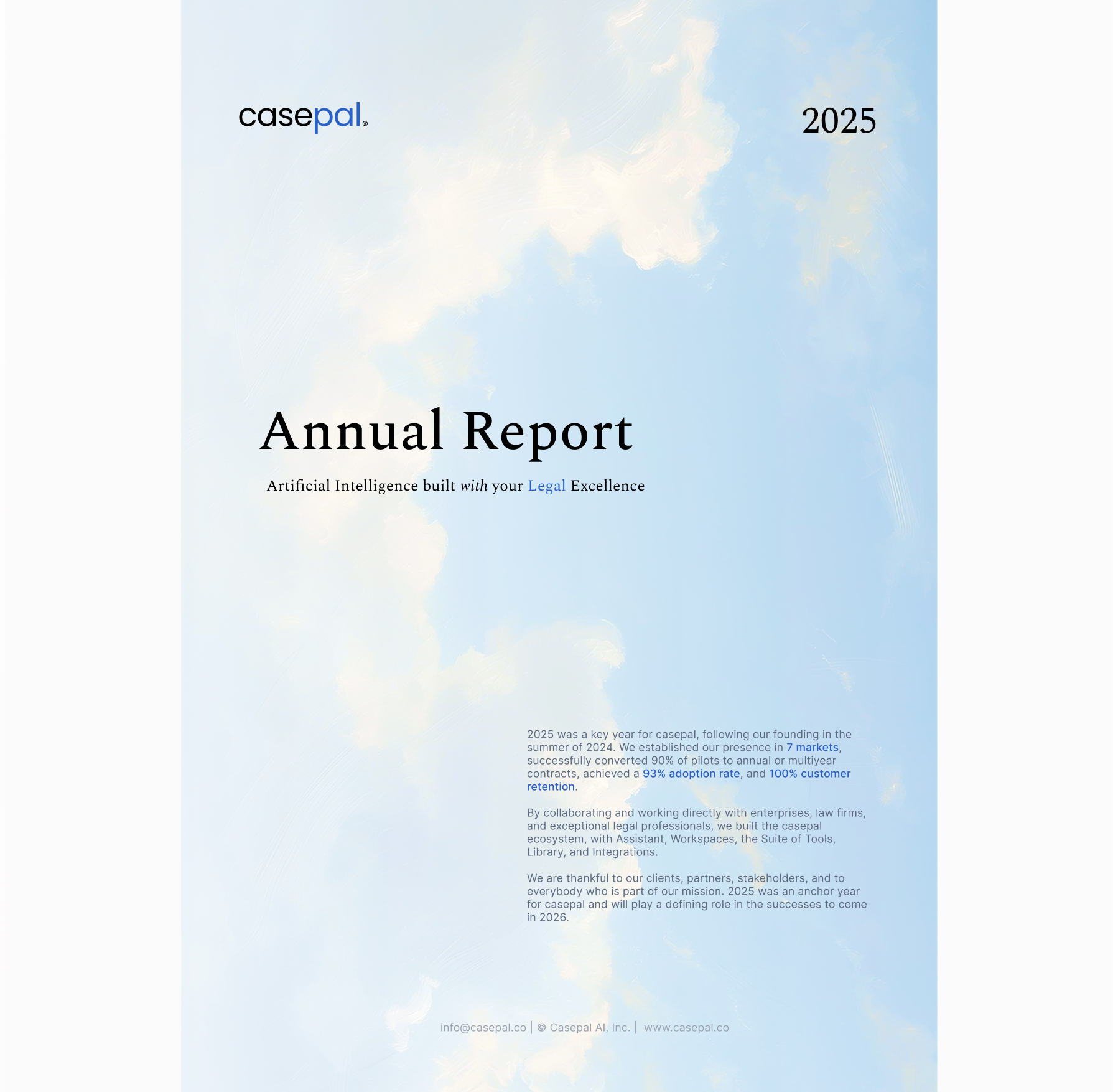 2025 was a key year for casepal, following our founding in the summer of 2024. We established our presence in 7 markets, successfully converted 90% of pilots to annual or multiyear contracts, achieved a 93% adoption rate, and 100% customer retention.