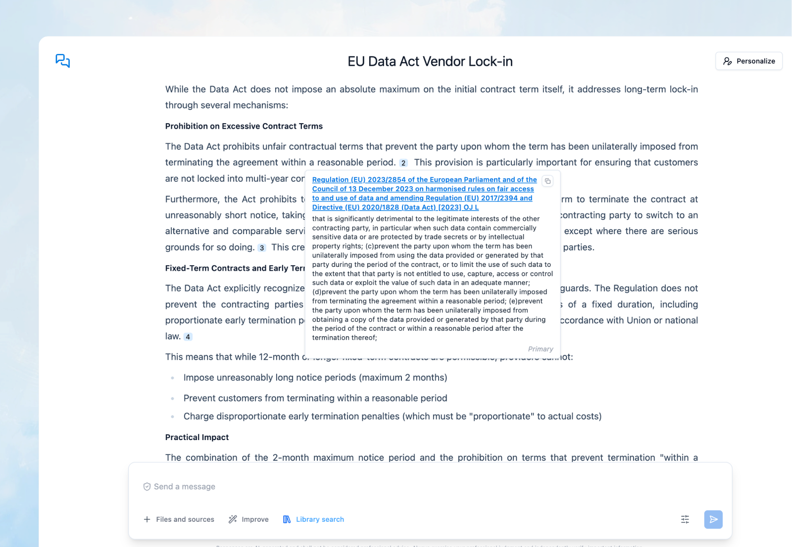 For example, when casepal cites your firm's standard force majeure clause from a template contract, you can click the citation to immediately view the full clause in context, verify its applicability to your current matter, and confirm that you're referencing the most recent version.
