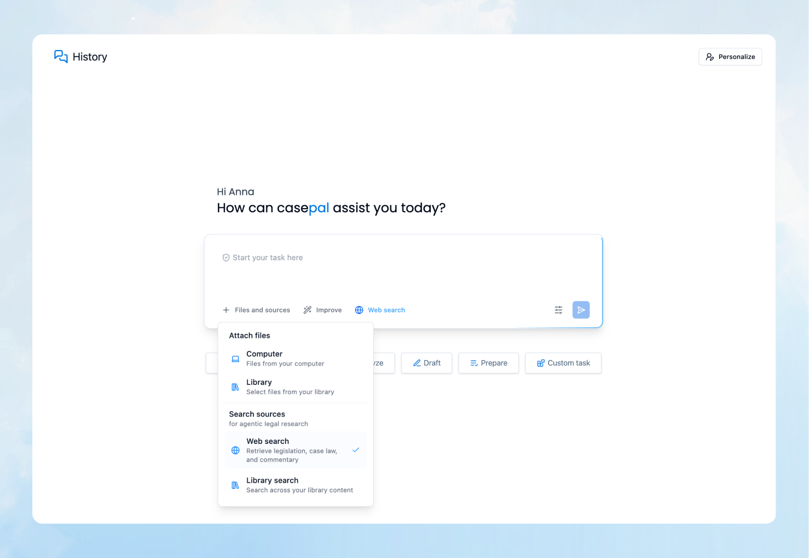 Previously, casepal determined autonomously whether to search your Library, the web, or both based on your query. While this intelligent routing remains the default behavior, you can now override it when your professional judgment requires a specific research path: