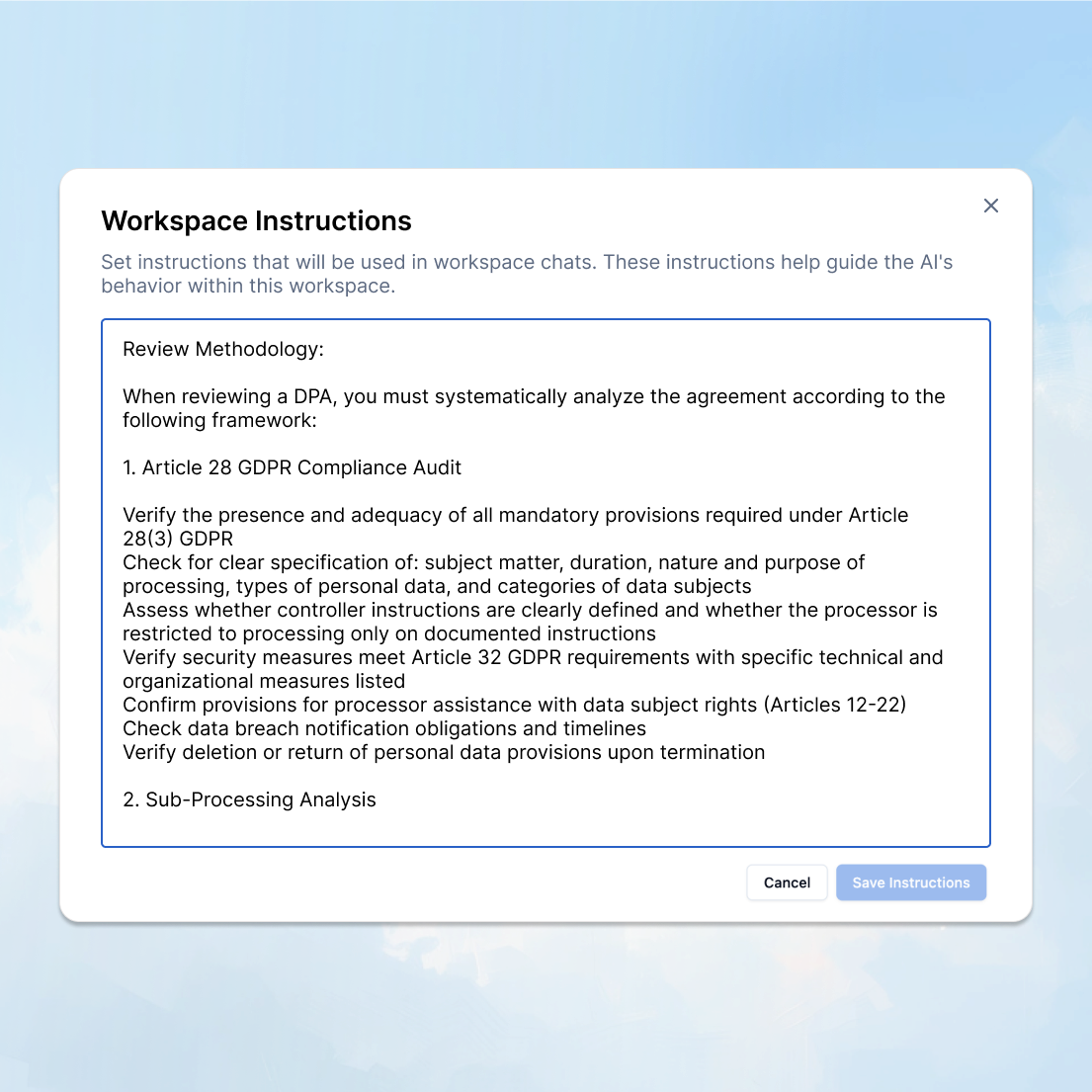 Define how casepal approaches tasks for each matter. Set jurisdictional frameworks, party identifications, and output formats that persist across all conversations and team members.