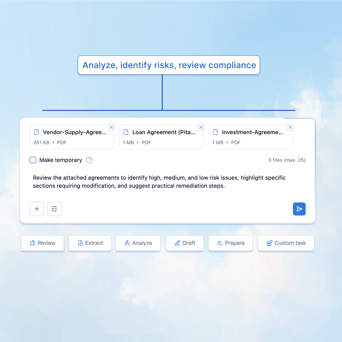 Analyze contracts, identify risks and missing provisions, review compliance with regulatory requirements, and receive structured, actionable findings.