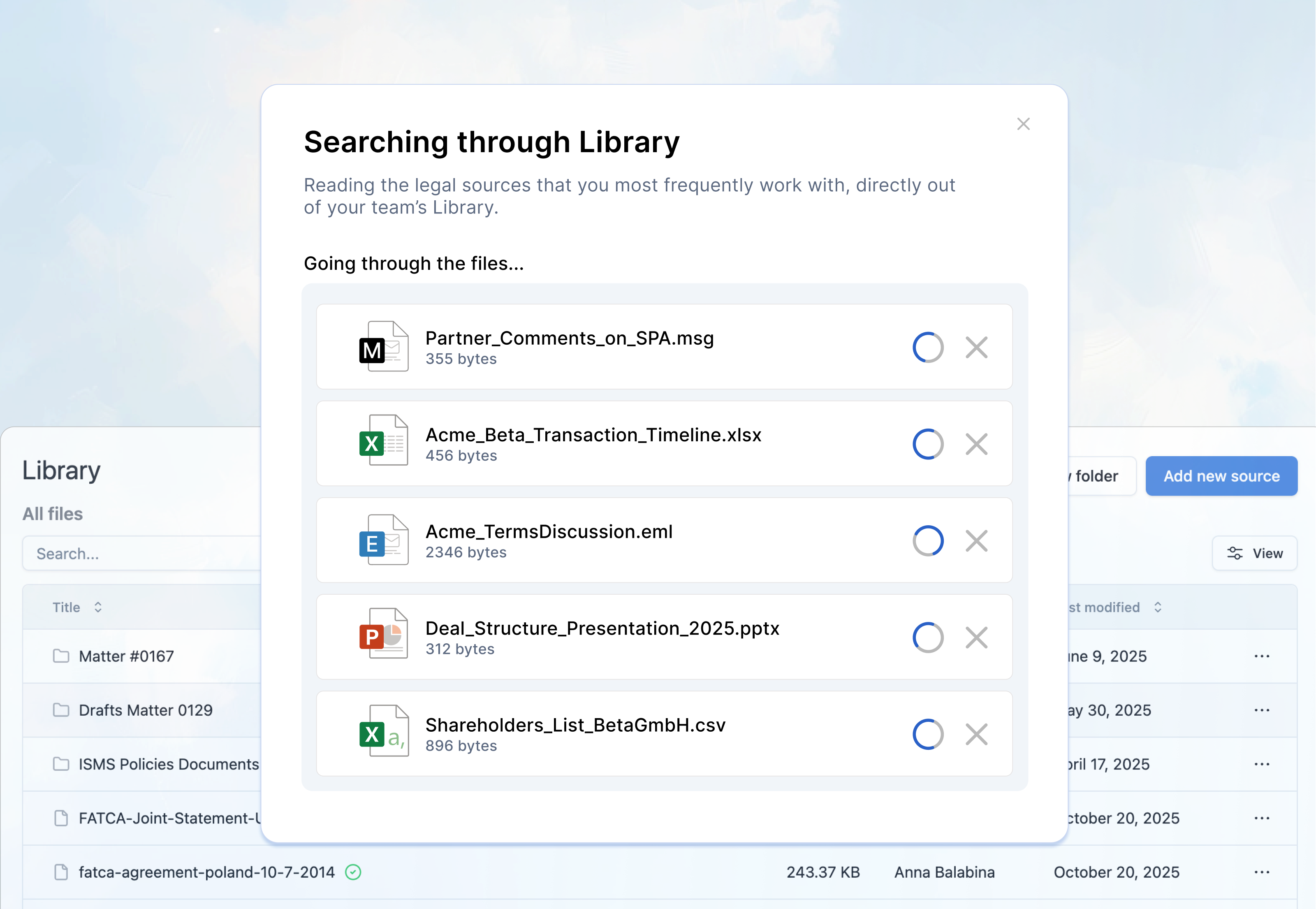 Dual-retrieval search using semantic understanding and keyword matching across your templates, precedents, past submissions, and case files. Part of Agentic Legal Research, combining external authorities and internal knowledge.