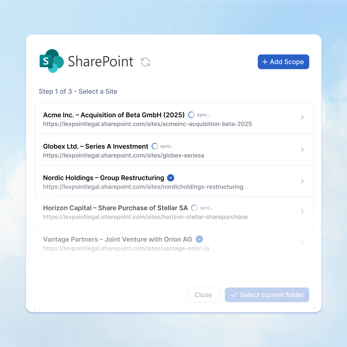 Synchronize with SharePoint and other Document Management Systems. Enable frontier AI retrieval and scoped access of institutional knowledge across the casepal ecosystem.
