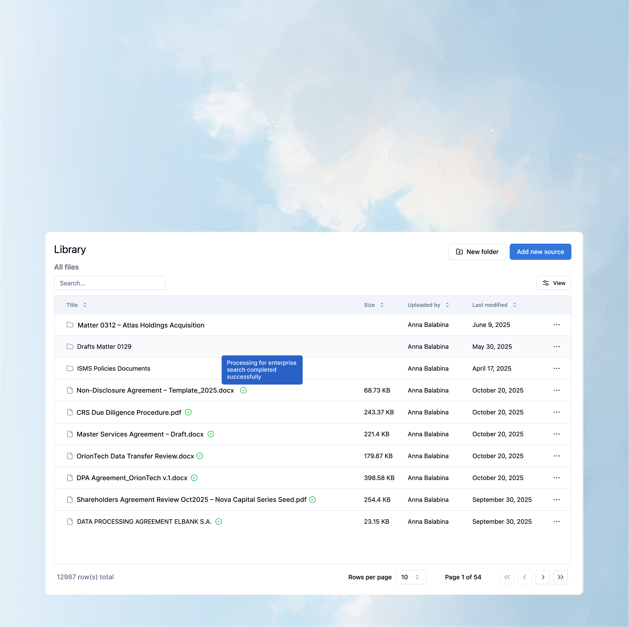 Advanced semantic and keyword search algorithms retrieve precise institutional knowledge instantly. Dual retrieval technology surfaces relevant templates, precedents, and matter files with frontier accuracy.