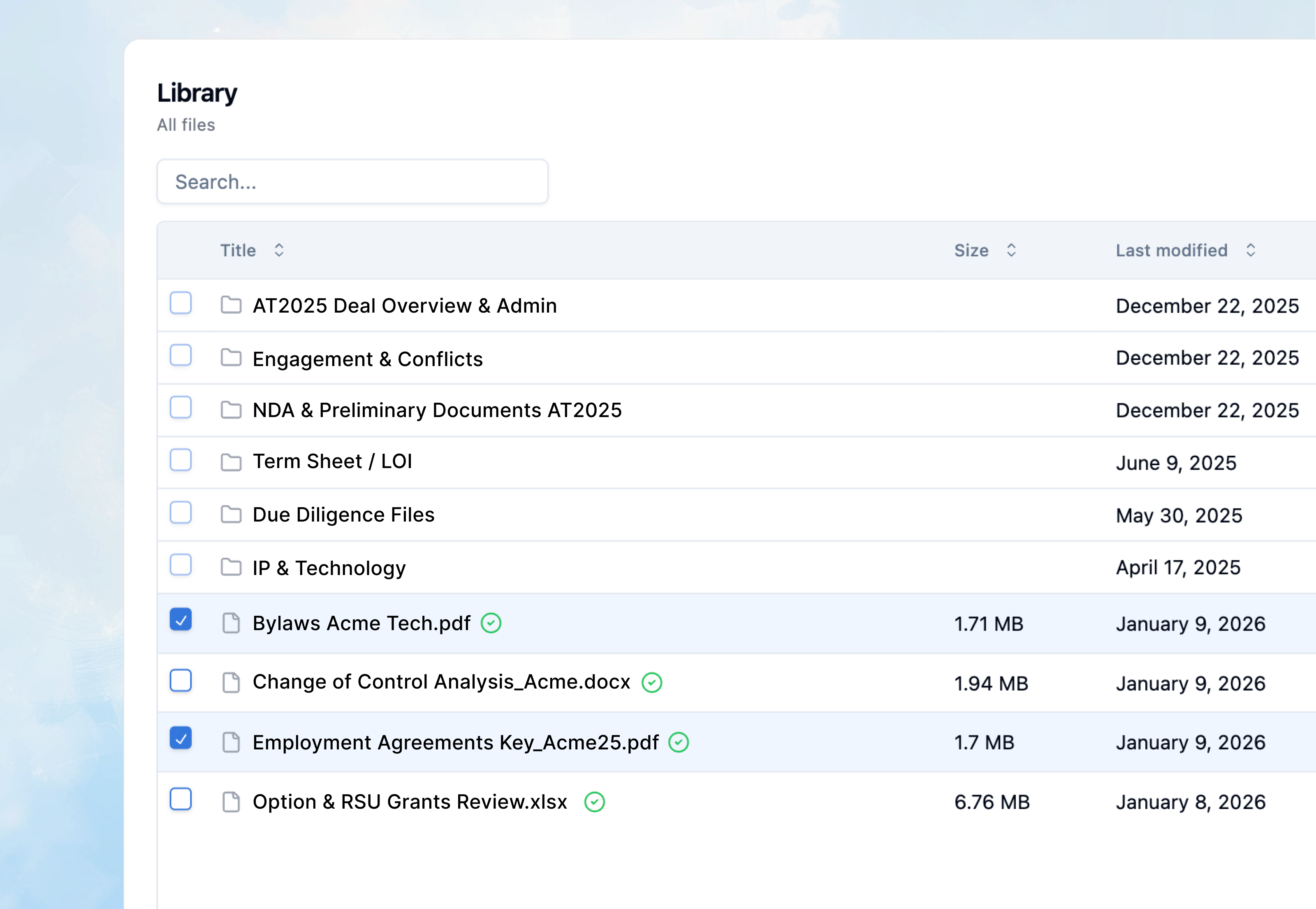 Files sync automatically from connected systems. Library updates continuously as documents are added or modified in source platforms, ensuring institutional knowledge remains current without manual uploads.