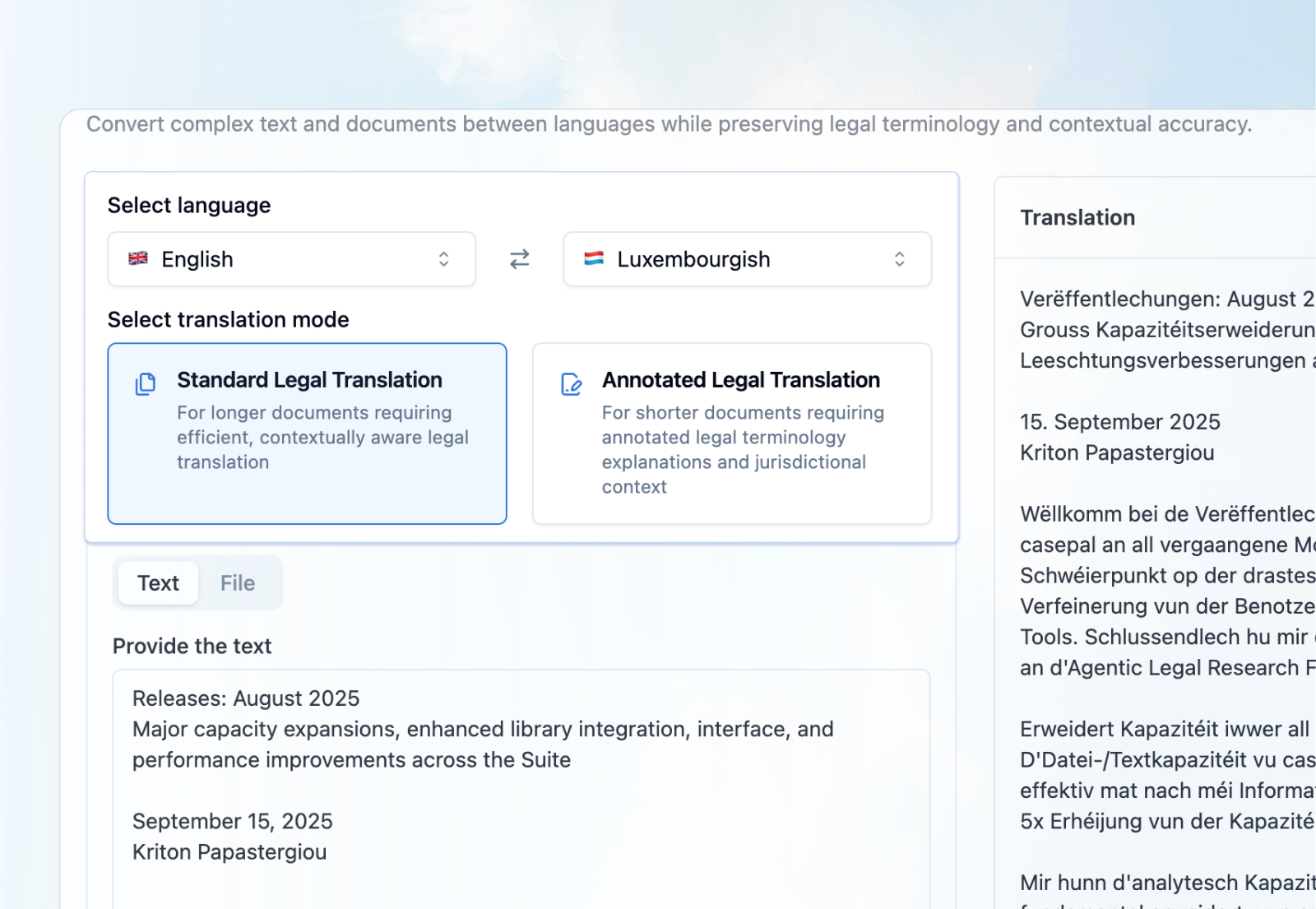 Translate complex documentation with contextual awareness and terminology accuracy. Standard mode for efficient contextual translation of lengthy documents; Annotated mode for cross-jurisdictional legal terminology explanations.