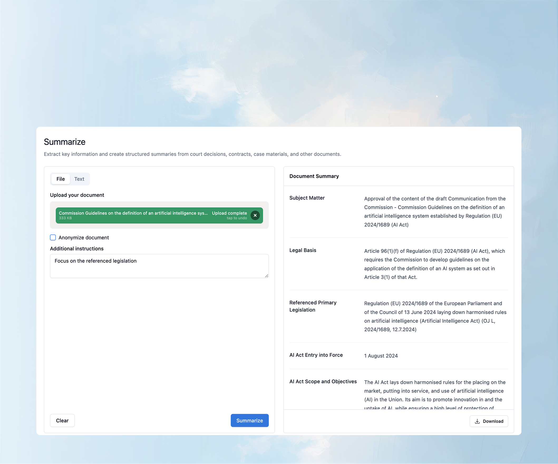 Break down complex legal or technical text into clear insights. Simplified overviews enable quick contextual understanding for you and accessible insights for clients and stakeholders.