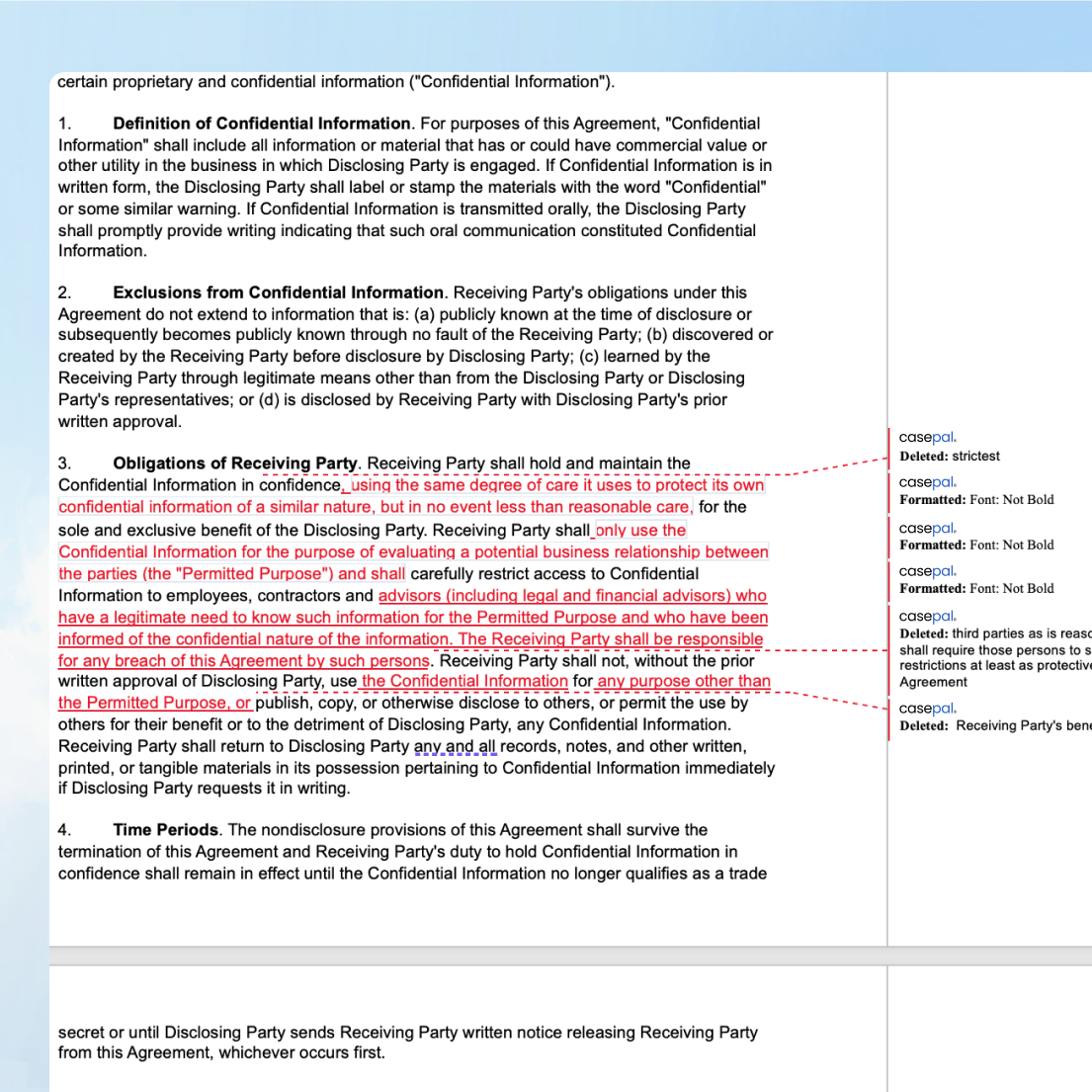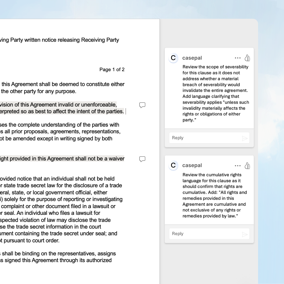 Draft and review in Word, connected to your firm's precedents and templates. The casepal Add-in integrates seamlessly into your workflow, letting you generate precise clauses, analyze, and refine language without switching contexts. Every suggestion is grounded, transparent, and verifiable.