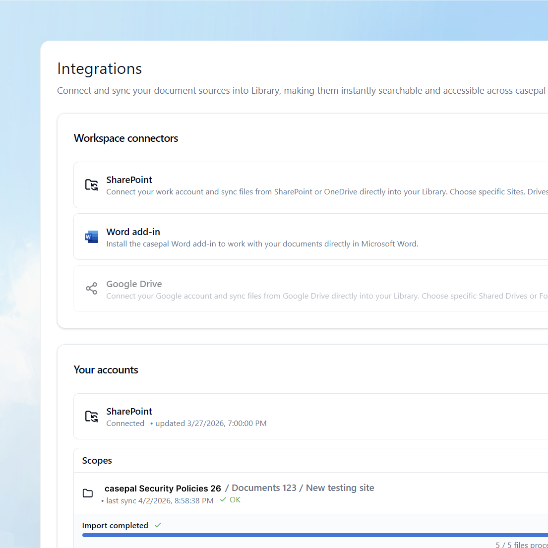 Seamlessly connect Word Add-In within your casepal ecosystem of tools, including Library documentation syncronization to casepal context in Word.